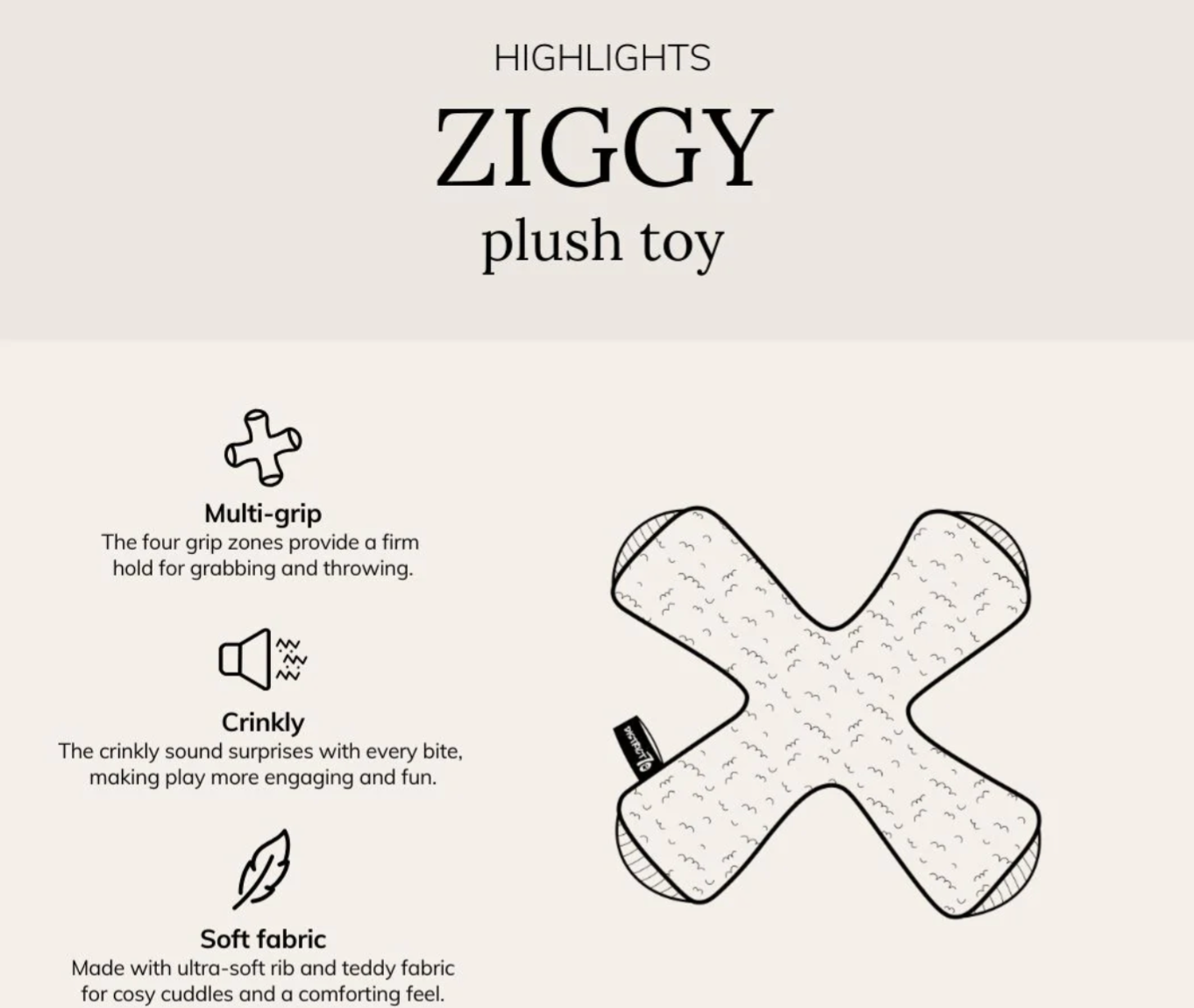 ZIGGY is a stylish and interactive dog toy that feels cuddly and simultaneously stimulates the senses. Thanks to the combination of a squeaker and crinkle material, ZIGGY offers varied playtime fun for dogs of all ages and sizes.