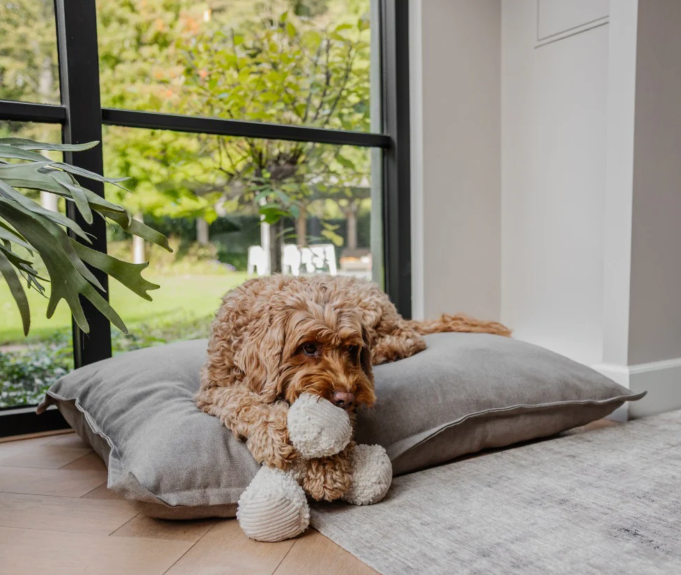 The cross-shaped cuddly toy is finished with ribbed edges for extra grip and is available in two sizes. The modern design in soft colors makes this toy not only attractive to dogs but also visually appealing in any interior.